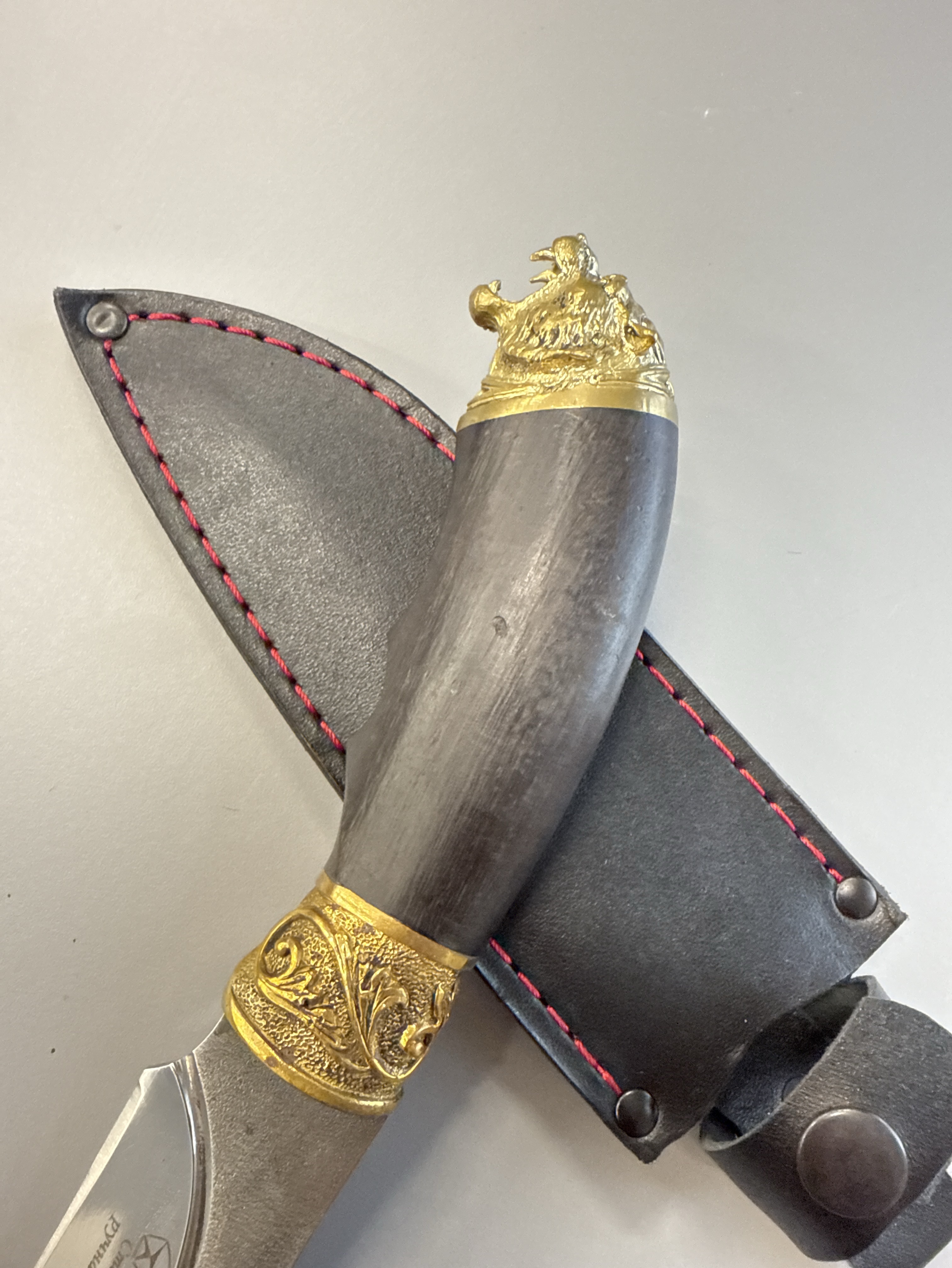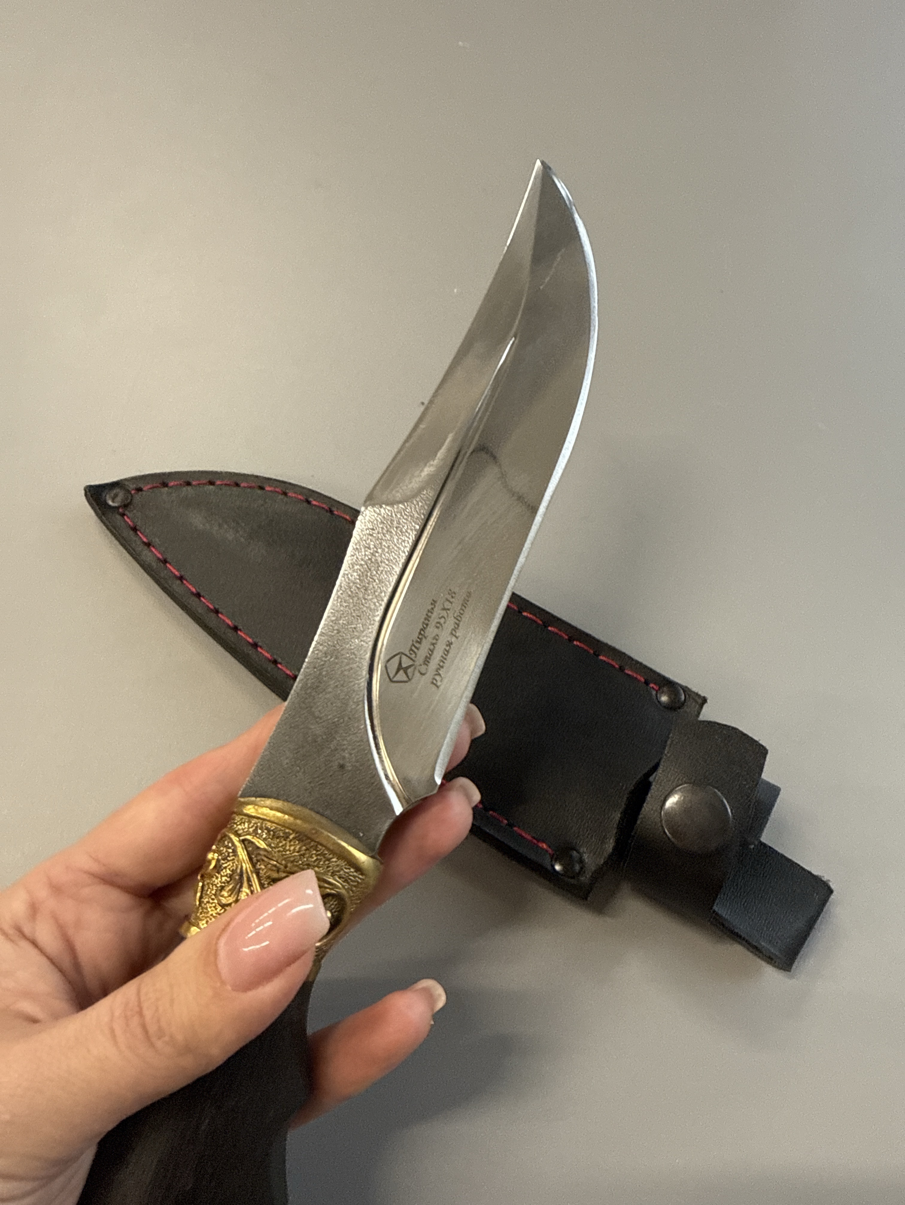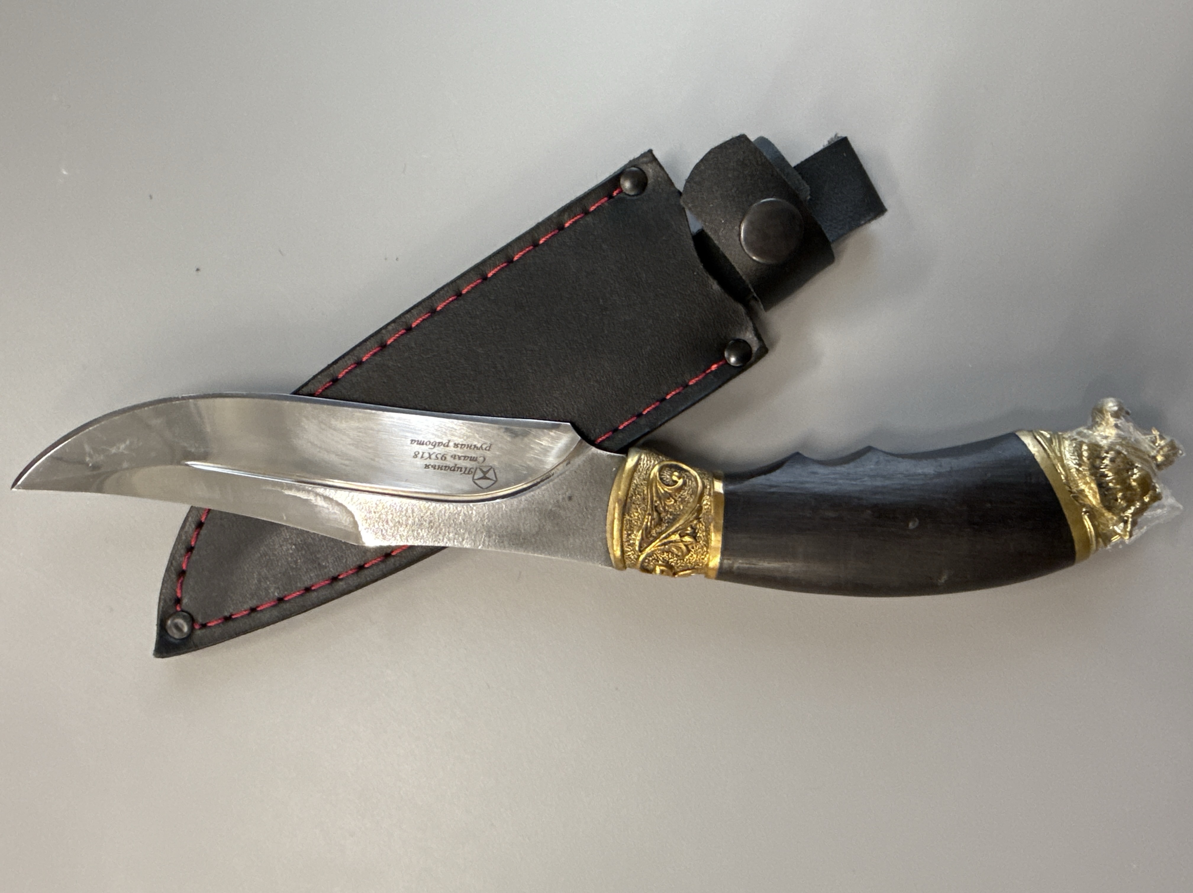 Классический кизлярский нож с выразительной латунной головой — это сочетание традиционного кавказского стиля, высокой прочности и удобства в работе. Модель выполнена из коррозионностойкой стали 95Х18, которая славится отличной твёрдостью, долговечностью и удержанием режущей кромки.