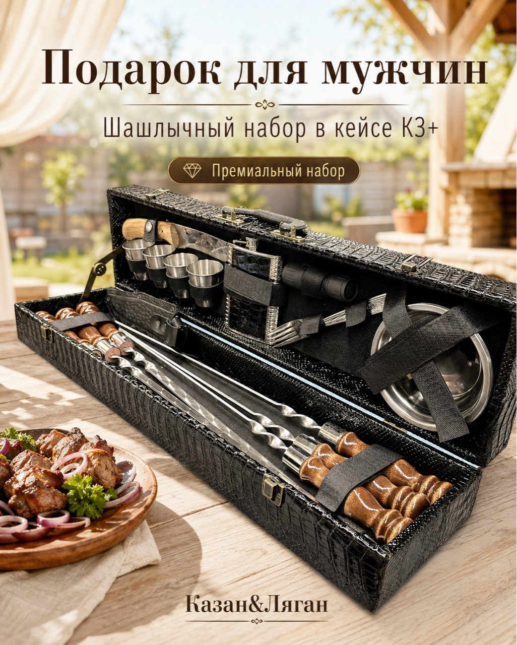 Идеальный комплект для настоящих ценителей отдыха на природе! Шампуры из прочной стали, удобный складной нож «Кизляр», всё необходимое под рукой! Входящие в набор стильные нержавеющие стопки, тарелки и удобные вилки сделают ваш пикник комфортным и эстетичным. Удобная упаковка позволяет взять весь комплект с собой куда угодно – от дачи до горного похода. Прислушайтесь к настоящим удовольствиям природы вместе со своим новым набором K3+