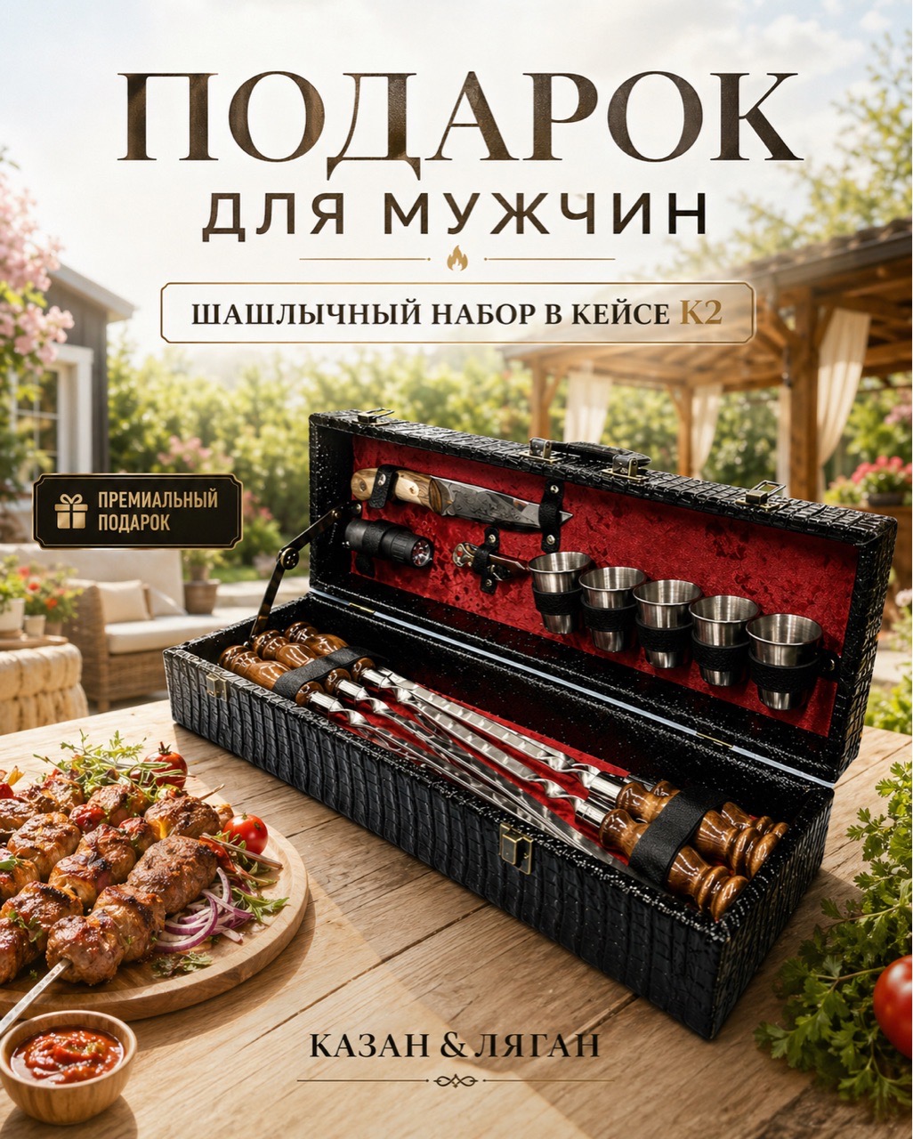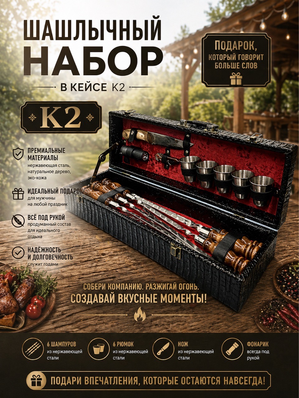 Идеальный комплект для незабываемых пикников и отдыха на природе! Шампуры из прочной стали обеспечат удобство приготовления пищи, стильный нож от бренда «Кизляр» станет незаменимым помощником, а удобные стопки подарят комфорт при сервировке. Фонарик поможет продлить удовольствие общения вечером, а открывалка быстро справится с банками и бутылками. Удобная сумка позволяет легко транспортировать весь набор – отдыхайте со вкусом!