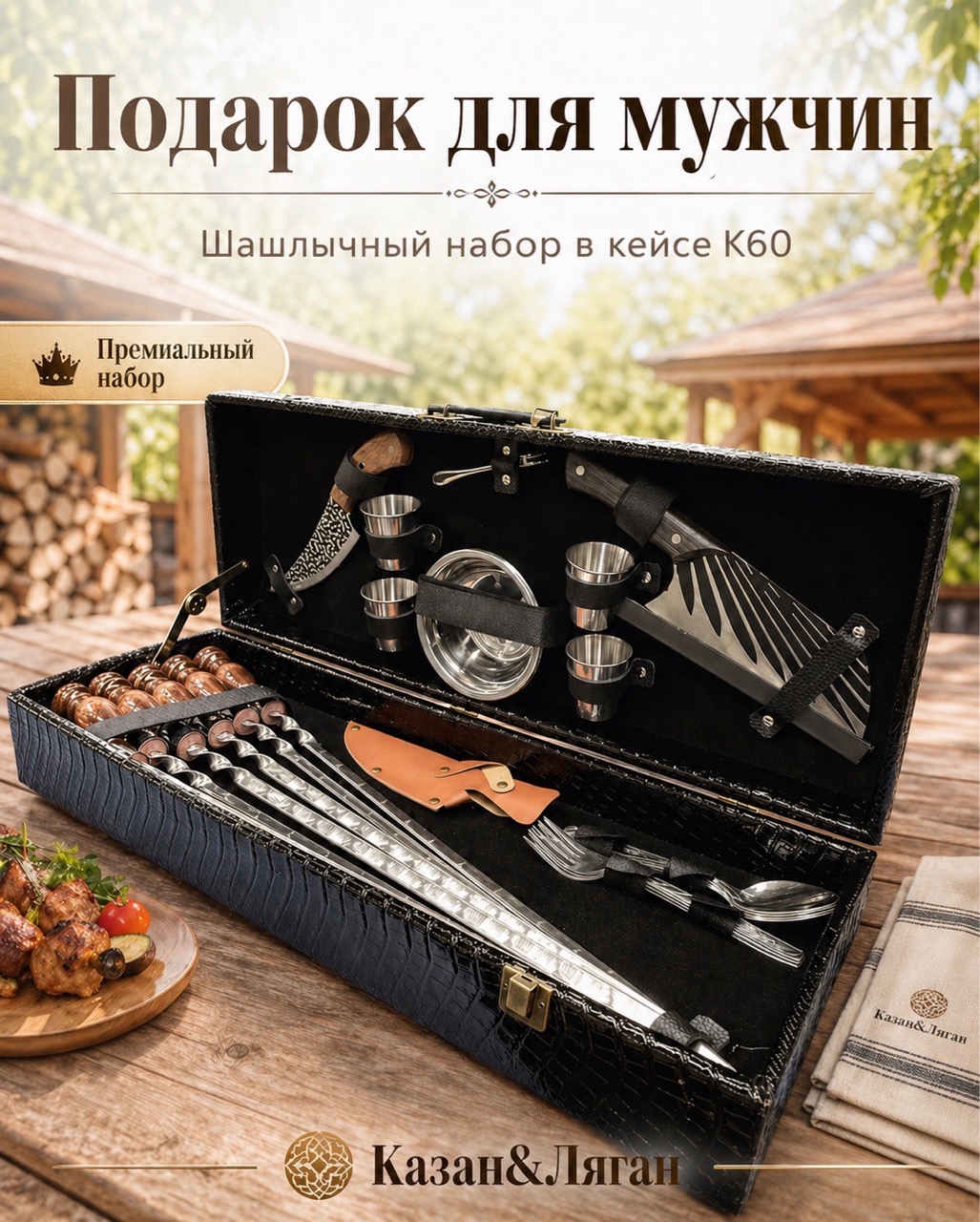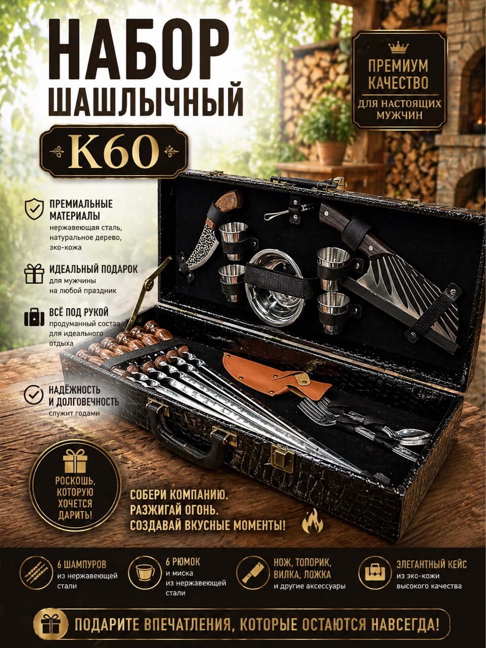 Откройте сезон пикников стильно и удобно! Наш шашлычный набор включает прочные нержавеющие шампуры, удобный складной нож «Кизляр», практичный мини-топорик, сервировку из четырёх стаканов, тарелок и вилок — всё необходимое под рукой! Преимущества: ✔ Идеально подходит для выездов на природу ✅ ✔ Компактность и удобство хранения ⏩ ✔ Высокое качество материалов 🌿 Ваш идеальный отдых начинается здесь!