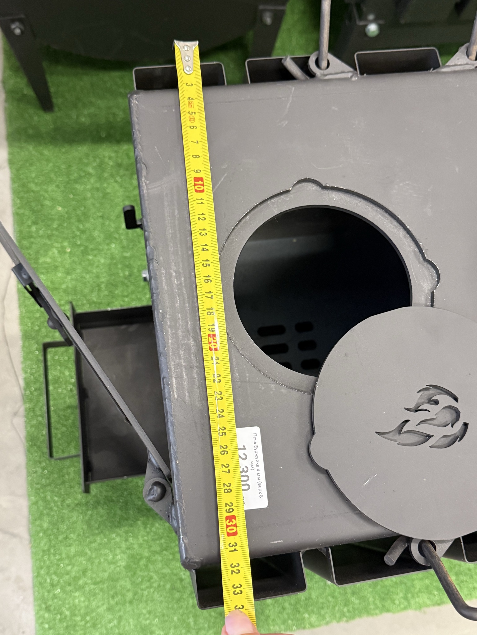 Безопасность эксплуатации дровяной печи буржуйки обеспечивает специальное усиление дна в зоне отверстий под зольник. Ножки с широкими подпятниками делают конструкцию устойчивой. Съемные ножки фиксируются болтами, что значительно облегчает эксплуатацию.